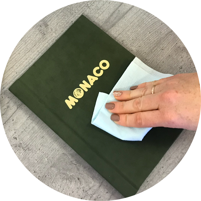 Egészen különleges mély, bársony hatású anyag. A legfinomabb érintés, a legkomolyabb luxus érzete, legelegánsabb megjelenés. Fínom, bársonyos jellege ellenére ellenálló, vízlepergető, tisztítható anyag. Egyszínű (ezüst, arany, fekete...) fólianyomtatással, vagy az igazán különleges eleganciát nyúltó, saját színébe mélyesztett (prégelt) eljárással perszonalizálható.